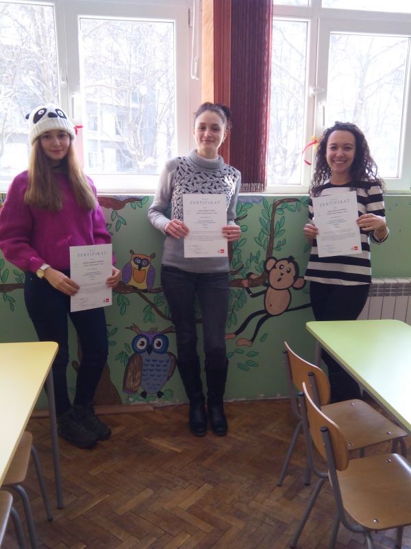 На 28.01.2017 г. в гр. София се проведе националният кръг на състезанието по немски език на издателство КЛЕТ България, в което взеха участие Ванесса Терзиева - 9 Г, Деница Стефанова - 10 Г и Таня Йорданова -11 Г. , които получиха своите сертификати. От над 200 участници от цялата страна нашите момичета се представиха блестящо. Ванесса Терзиева зае първо място от участвалите на ниво А2 с максимален брой точки. Деница и Таня също се класираха в призовата четворка. Браво, момичета! Гордеем се с вас! Поздравяваме ви за високите постижения и ви пожелаваме все така успешни изяви!