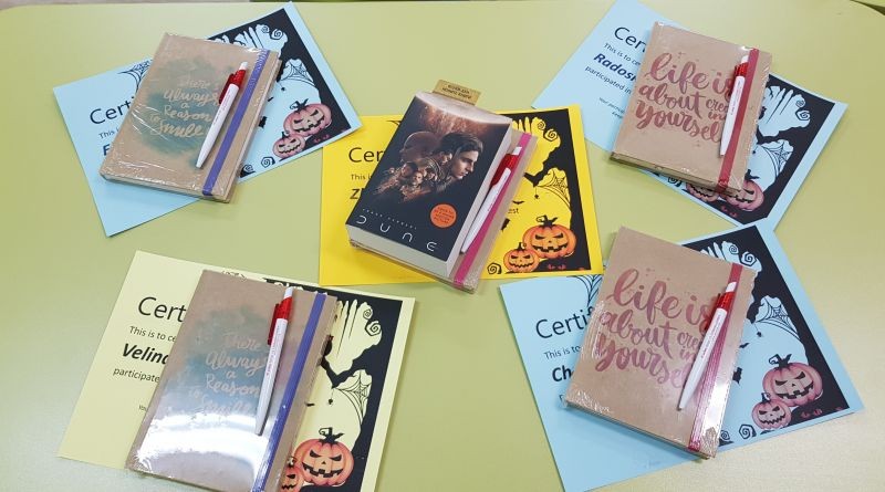 "Днес (02.12.2021г.) бяха наградени участниците в конкурса за авторска история на английски език -Scary Story Writing Contest. На първо място беше отличена работата на Жана Йоргова от 12е клас. Представянето на останалите участници също бе достойно - Екатерина Димчева и Кристиян Жеков от 10в, Радослава Маринова от 12г и Велина Пенчева от 9б.