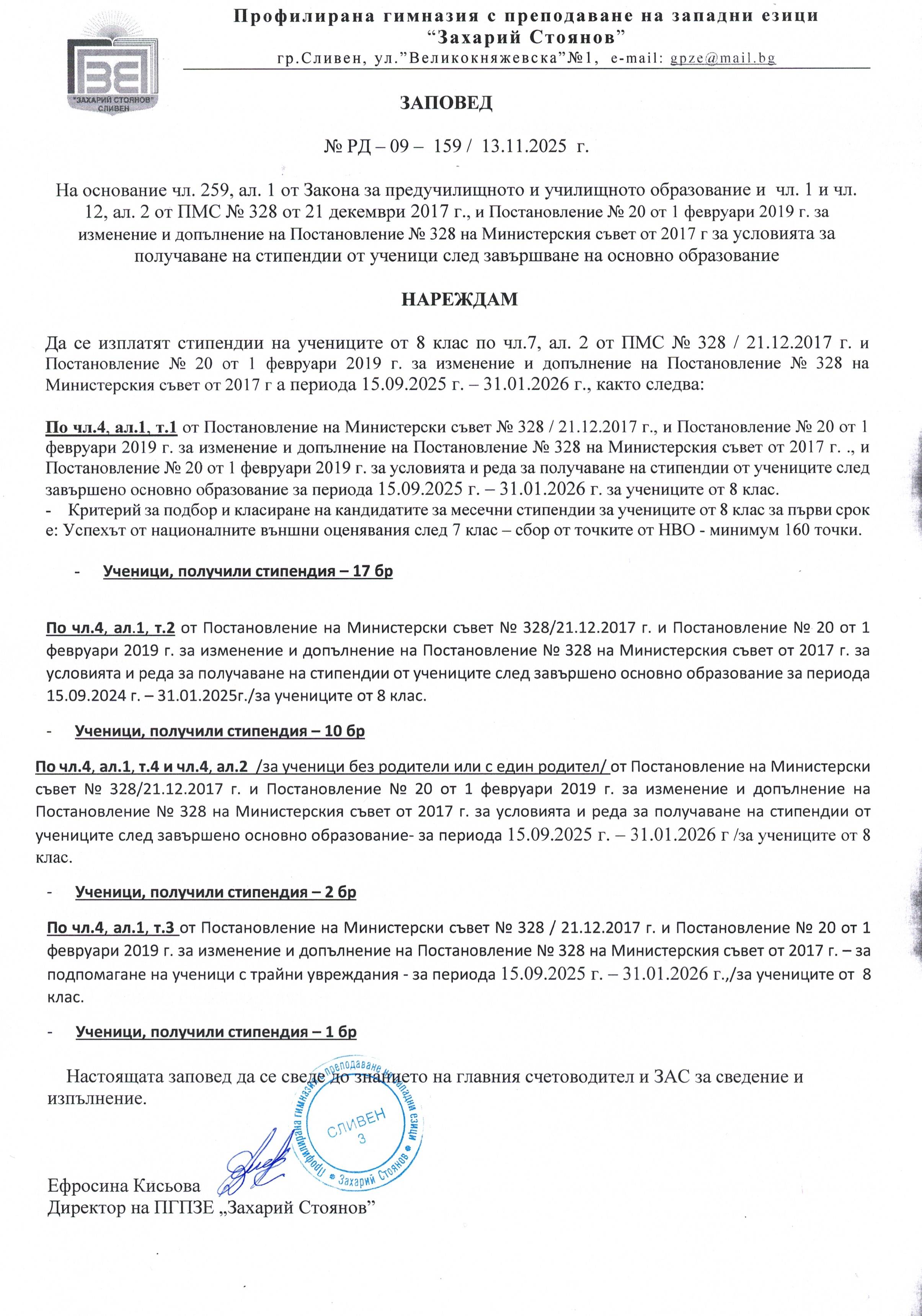 Заповед за изплащане на стипендии за 2 срок на учебната 2023-2024